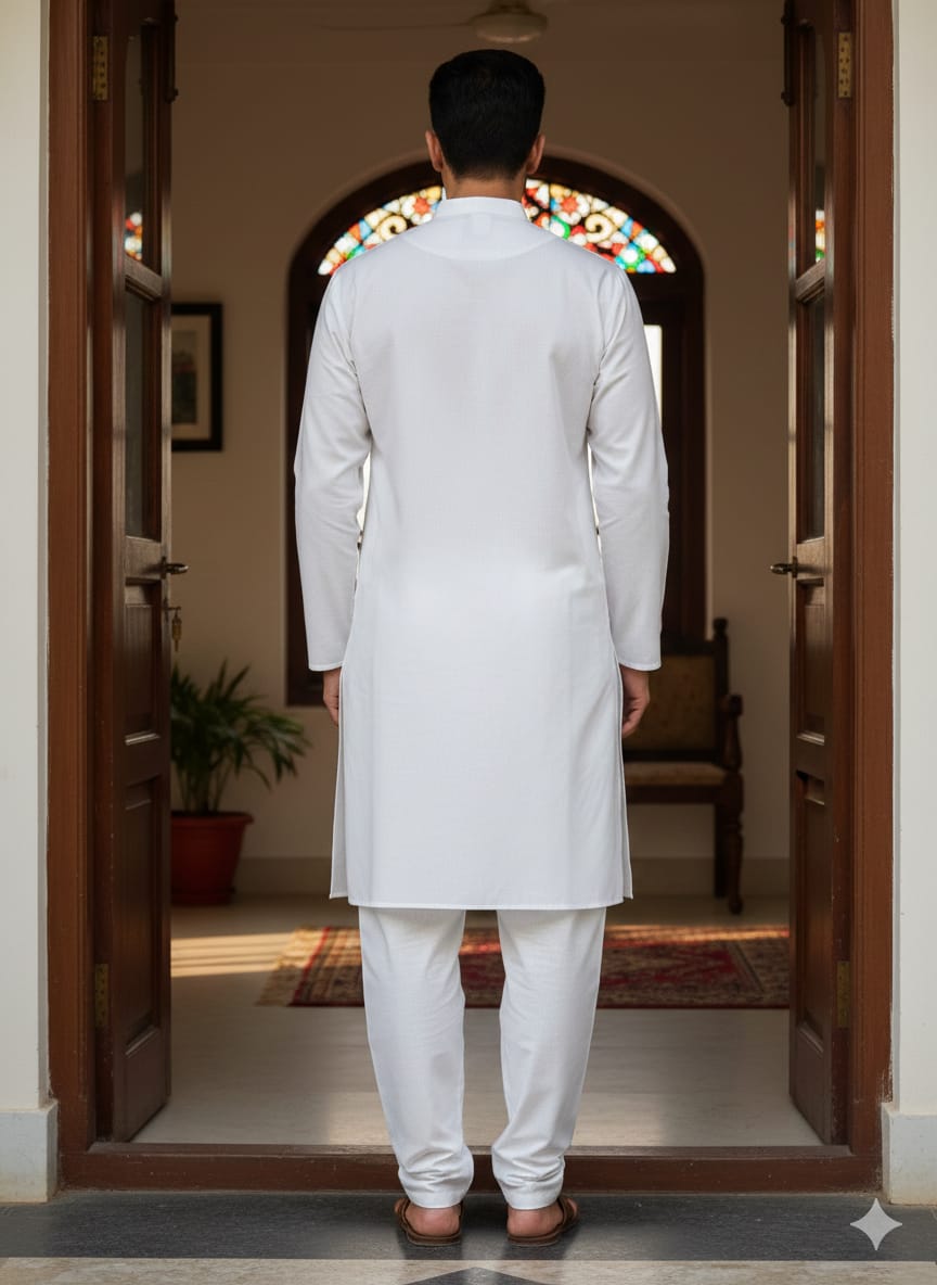 Upgrade your ethnic wardrobe with this elegant Solid Off White Cotton Kurta with Pajama, designed for comfort, simplicity, and timeless style. Crafted from premium breathable cotton fabric, this set keeps you cool and comfortable all day long — making it perfect for festive occasions, family gatherings, religious events, or casual traditional wear.